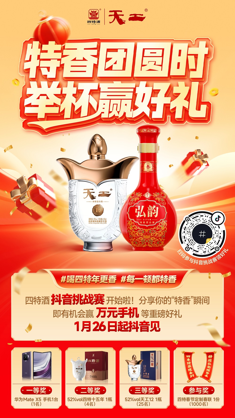团圆是春节的核心,举杯则是团圆宴上最具仪式感的情感表达时刻。本次四特酒#每一顿都特香 抖音挑战赛,聚焦新春团圆的餐桌之上,为每一个归家团圆的江西人记录幸福时刻。#每一顿都特香 主题挑战赛全程历时一个月(1月26日至2月25日),在你和家人、朋友、同事的相聚时刻,举起手机拍摄一段春节团圆举杯视频,说出“在XX(城市),每一顿都特香”,带上话题#喝四特年更香、#每一顿都特香,并@四特酒官方旗舰店,即可参与挑战赛,赢取价值万元的华为Mate X5折叠屏手机、四特十五年、四特天工12等定制好礼。